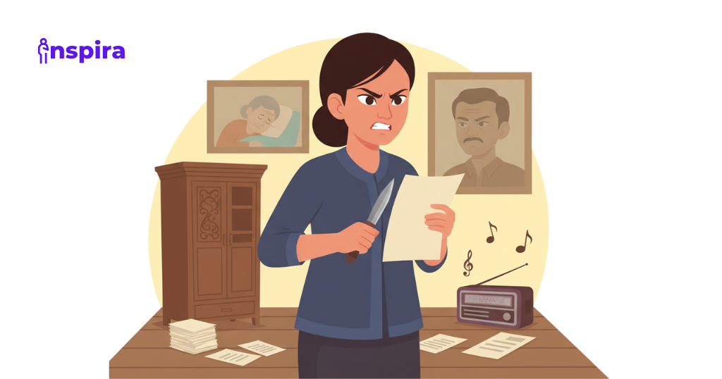 Sebuah ruangan sederhana dengan beberapa perabot tua. Ada meja kayu berukir tua di sudut, sebuah kursi goyang di tengah, dan foto-foto keluarga yang terpajang di dinding. Di sudut lain ada sebuah lemari tua yang menyimpan dokumen-dokumen pusaka. Lantai panggung tersebar dengan kertas-kertas dan beberapa surat tanah.