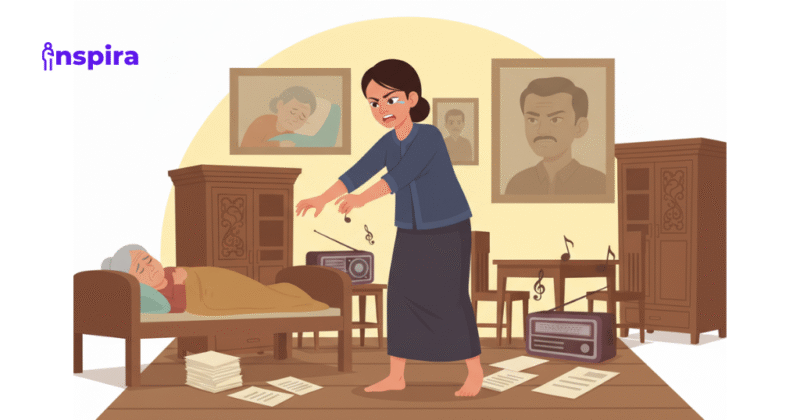 Sebuah ruang yang dihiasi oleh sepasang meja dan kursi, dan sebuah dipan tua yang sudah tak layak pakai, di atas dipan tidur seorang perempuan dengan nyenyaknya, seorang perempuan masuk lalu menghampiri sudut ruangan. Suara musik mendayu lembut sebuah lagu tempo dulu dengan manis keluar dari sebuah radio kecil di sebelah tidur perempuan itu. Perlahan lampu kelihatan redup.